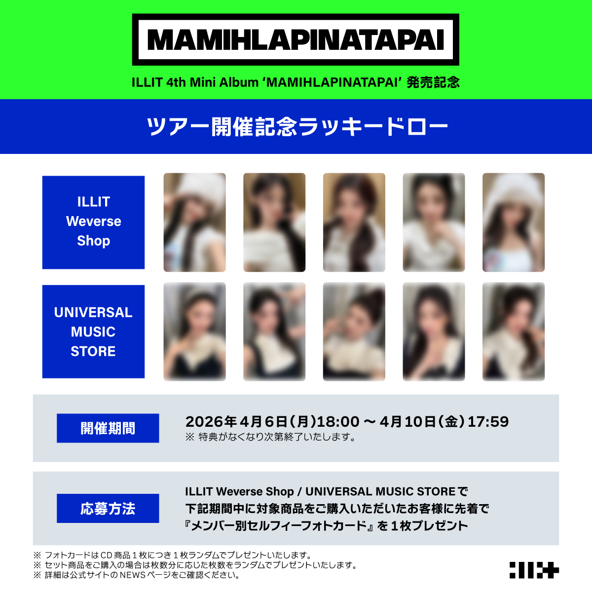 ILLIT Weverse Shop、UNIVERSAL MUSIC STOREで下記期間中に対象商品をご購入いただいたお客様に先着で2025年12月の日本活動期間中に撮影した『メンバー別セルフィーフォトカード』をプレゼントいたします。