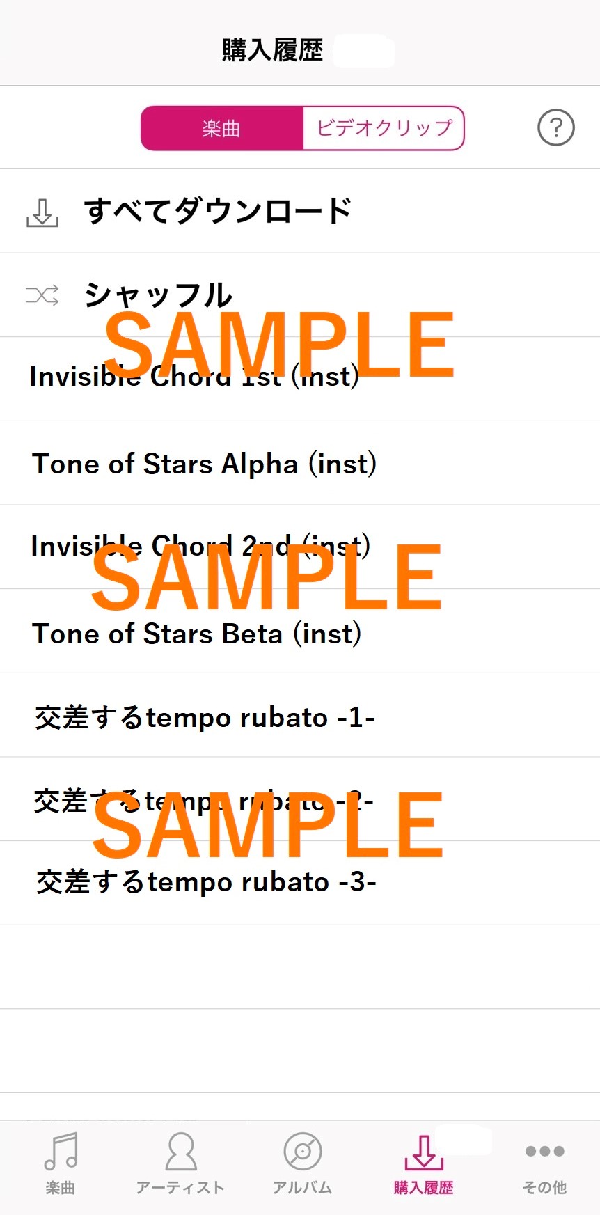 レコチョク アプリ(Androidの場合)、レコチョクplus+プレイヤー(iPhoneの場合)での収録曲7曲が載っている購入履歴画面のスクリーンショットが対象となります。
