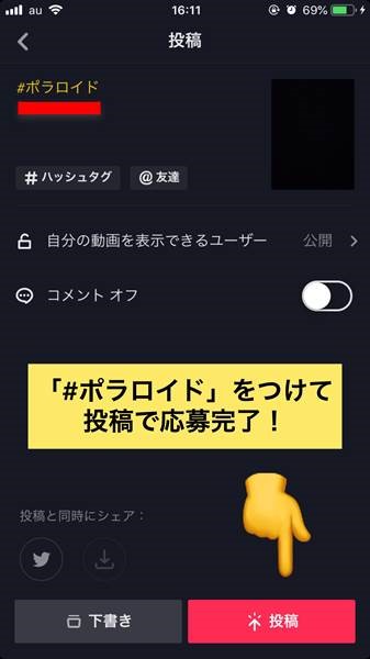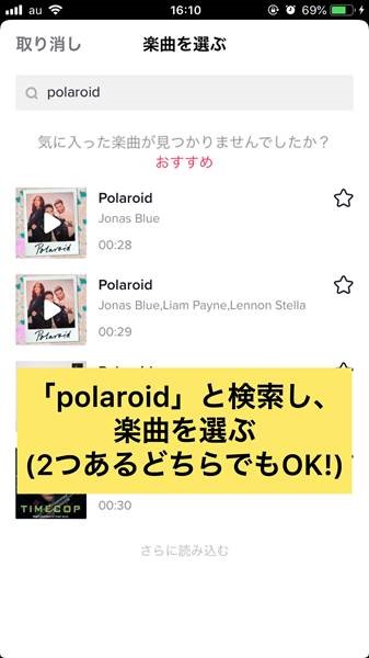 ② 撮影動画にジョナス・ブルー「ポラロイド feat. リアム・ペイン&レノン・ステラ」を使用し、ハッシュタグ「#ポラロイド」をつけて投稿すれば応募完了!