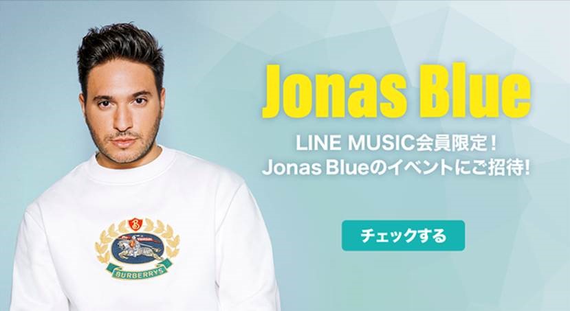 LINE MUSIC会員10組20名様を、11/27(火)の『ブルー』リリース・パーティーにご招待! 2018.11.09 TOPICS 本日11月9日(金)、待望のデビューアルバム『ブルー』をリリースしたジョナス・ブルー。そのリリース・パーティーが11月27日(火)に開催決定!この「Jonas Blue『BLUE』Release Party@WARP SHINJUKU」に、10組20名のLINE MUSIC会員を無料ご招待いたします。 詳しくは、ジョナスが目印のLINE MUSICアプリトップバナーからチェック!