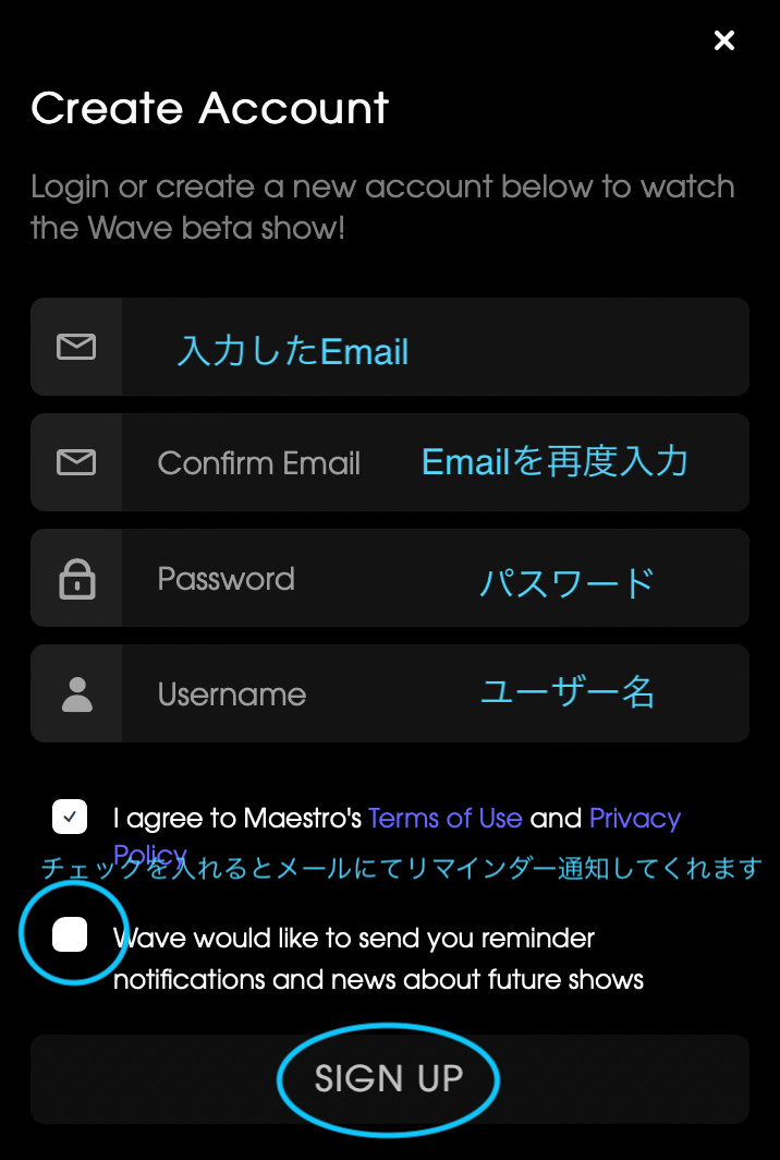 ③必要情報を入力し、SIGN UPボタンをクリックするとユーザー登録完了です。