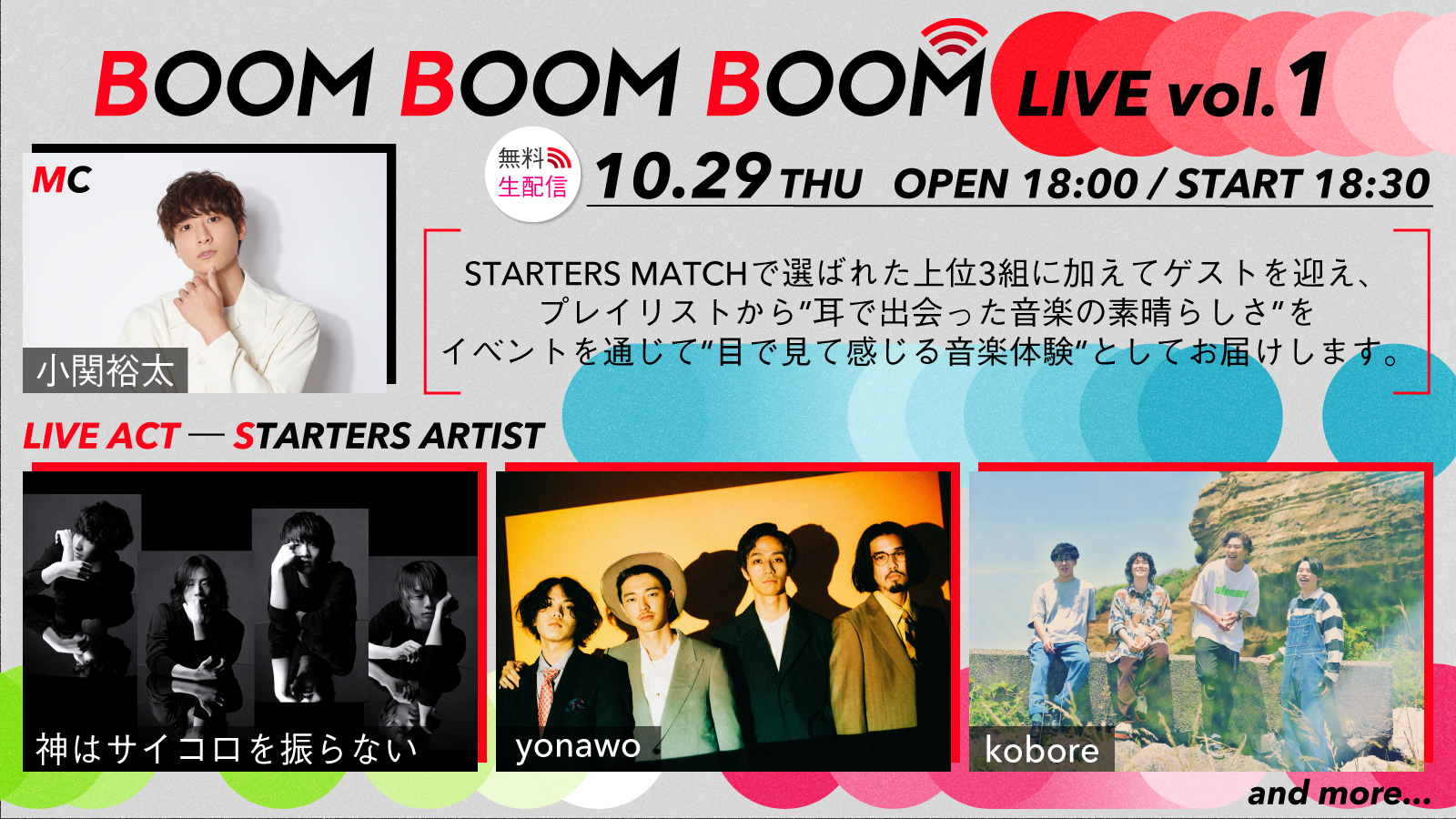 このイベントは、今後の音楽シーンを先取りできる必聴プレイリスト「BOOM BOOM BOOM」が開催するイベントで、新人応援企画「STARTERS MATCH」から選ばれた上位3組に加えてゲストを迎え、プレイリストから”耳で出会った音楽の素晴らしさ”を、イベントを通じて”目で見て感じる音楽体験”として画面越しにお届けするもの。