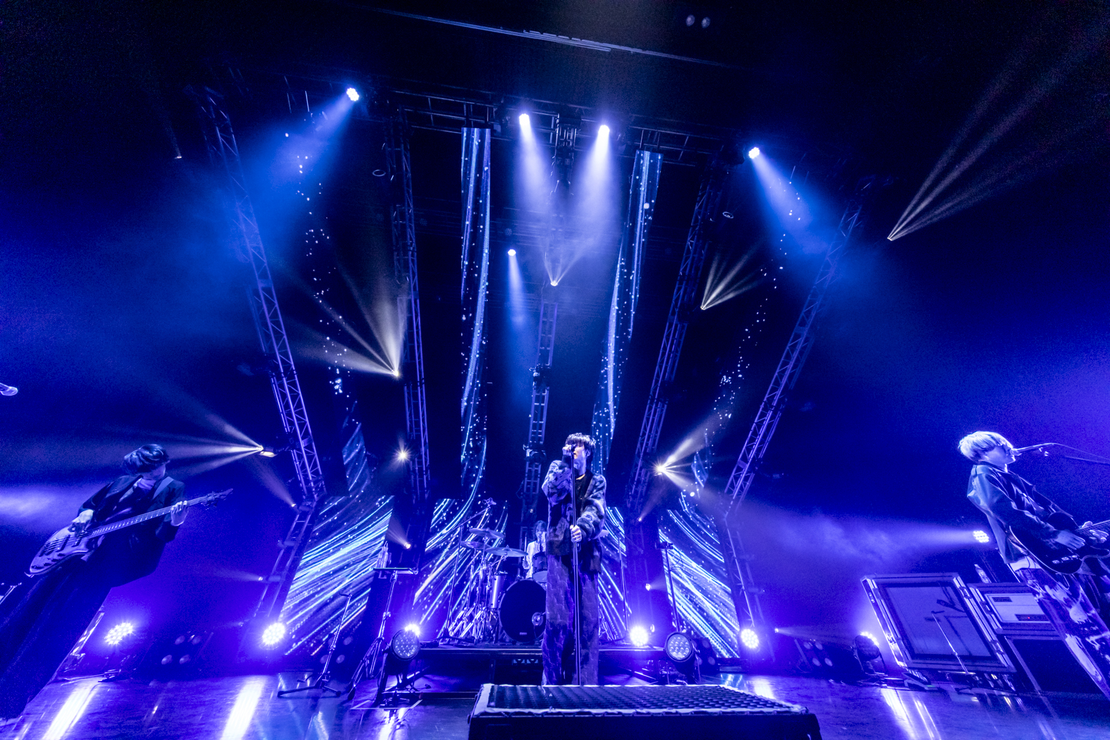 本ツアーの為に新たに制作されたオープニング楽曲が鳴り響き、特殊形状のLEDを這うような映像演出と特殊形状のトラスにも仕込まれた照明演出が会場の世界観を一変させる中、観客の拍手喝采に包まれながらメンバー1人1人が順次登場。ベース桐木、ギター吉田、ドラム黒川に続き、ボーカル柳田が走りながら登場しステージ左右で煽った後にステージセンターで「始まりの唄を今歌おう」という一節ではじまる「巡る巡る」を披露しはじめると、一気に会場のボルテージはMAXに。立て続けに「タイムファクター」「イリーガル・ゲーム」とアップテンポの人気楽曲をパフォーマンスし、場内をヒートアップさせ、冒頭から会場を神サイの世界観に包み込んだ。