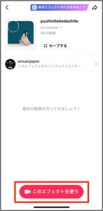 ➀Tiktokにて「ユニバーサルミュージック」のアカウント(https://www.tiktok.com/@umusicjapan)にアクセスし、エフェクトのタブより「yuuhinitokedashite」を選択