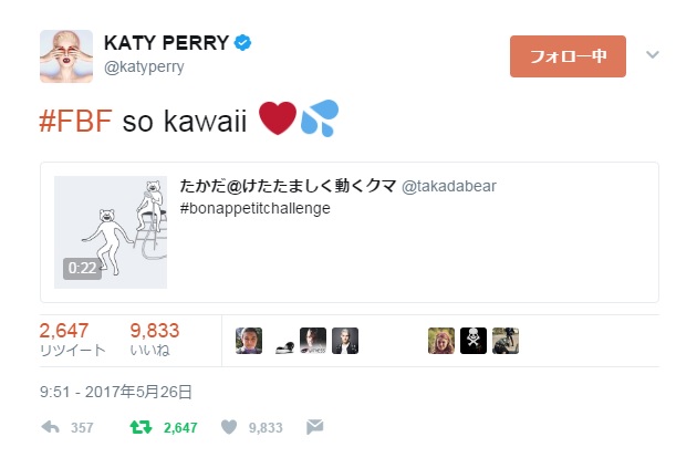 引用投稿されたのは、LINEスタンプで人気の「けたたましく動くクマ(通称:けたクマ)」シリーズを手掛けるクリエイターの『たかだ@けたたましく動くクマ』さん。同シリーズのLINEスタンプはスタンプショップのランキングでも1位を獲得し、“2016年を象徴するスタンプ”を選出する「LINE Creators Stamp AWARD 2016」では特別賞を受賞した人気クリエイターだ。そんなたかださんが先日、ケイティの楽曲「ボナペティfeat. ミーゴス」に合わせて動くアニメーションをTwitterに投稿。すると、ケイティがその投稿を引用して「so kawaii♥」と紹介。世界No.1のフォロワーを持つケイティに紹介されたことによってこの投稿はたちまち拡散され、たかださんのもとには普段は全く来ないという海外からの投稿が大量に寄せられるなど大反響だったという。たかださんは「Twitterの通知を見て心臓が飛び出ました!周りからは、ピコ太郎フィーバーくるんじゃない!?と言われて淡い期待をしています。笑」と反響の大きさに驚いた様子だ。