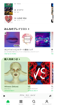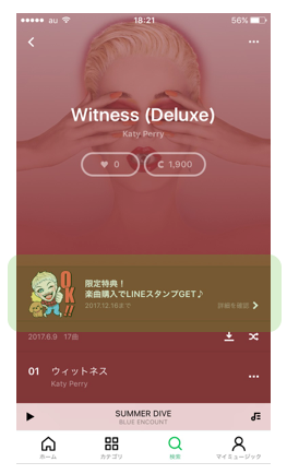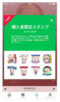 1)「LINE MUSIC」アプリ内にて「ケイティ・ペリー」を検索し、該当アルバムをタップ