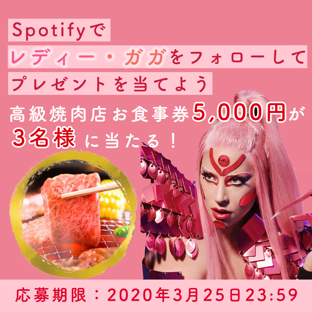 期間中にSpotifyでレディー・ガガをフォローの上、専用フォームより応募すると、抽選で高級焼肉店お食事券5,000円分を3名様にプレゼント。