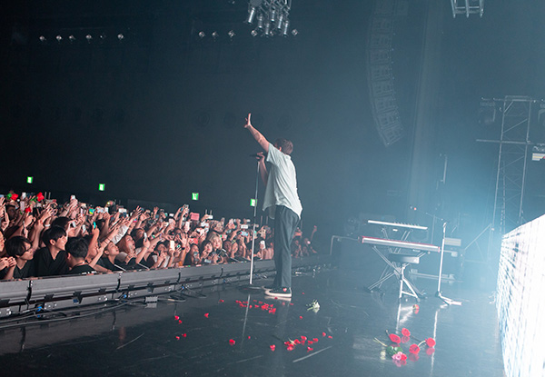 美しい音色のシンセサイザー、そして優しいギターに、ポールの柔らかくも力強い美声が絶妙なバランスで保たれたLANYのライヴは聴覚的にはもちろん、CDのアートワーク同様、ストリート・カルチャーや現代アートからインスピレーションを受けているであろう美しい映像が、バンドの後ろに設置された天井から床までの巨大なスクリーンに投影されており、視覚的にも実に美しいライヴでした。中でも、本編最後に披露されたアルバムのタイトル・トラック「マリブ・ナイツ」では、ポールのバラードに乗せて満点の星空がバック・スクリーン全面に映し出され、観る者にまるで夜中にマリブにいるような疑似体験も。