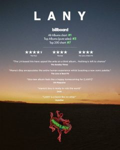 ニュー・アルバムが全米7位を獲得! 2020.10.15 TOPICS 10/2にリリースとなったLANYの最新アルバム『ママズ・ボーイ』が、全米アルバム・チャート初登場7位に輝きました!まだの方は、ぜひアルバムをお聴きになってみてください! *全米アルバム・チャートはこちらhttps://www.billboard.com/charts/billboard-200