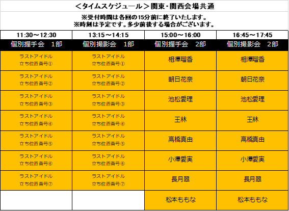 ■いずれの開催日でも、主催者側によって各メンバー別に割り当てた開催時間内での握手対応とさせて頂きます。時間外での対応は致しかねますことをご留意ください。