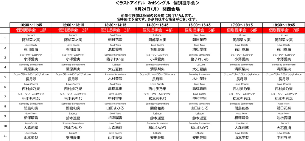 ■いずれの開催日でも、主催者側によって各メンバー別に割り当てた開催時間内での握手対応とさせて頂きます。時間外での対応は致しかねますことをご留意ください。