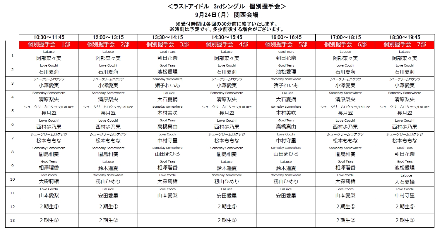 ■いずれの開催日でも、主催者側によって各メンバー別に割り当てた開催時間内での握手対応とさせて頂きます。時間外での対応は致しかねますことをご留意ください。