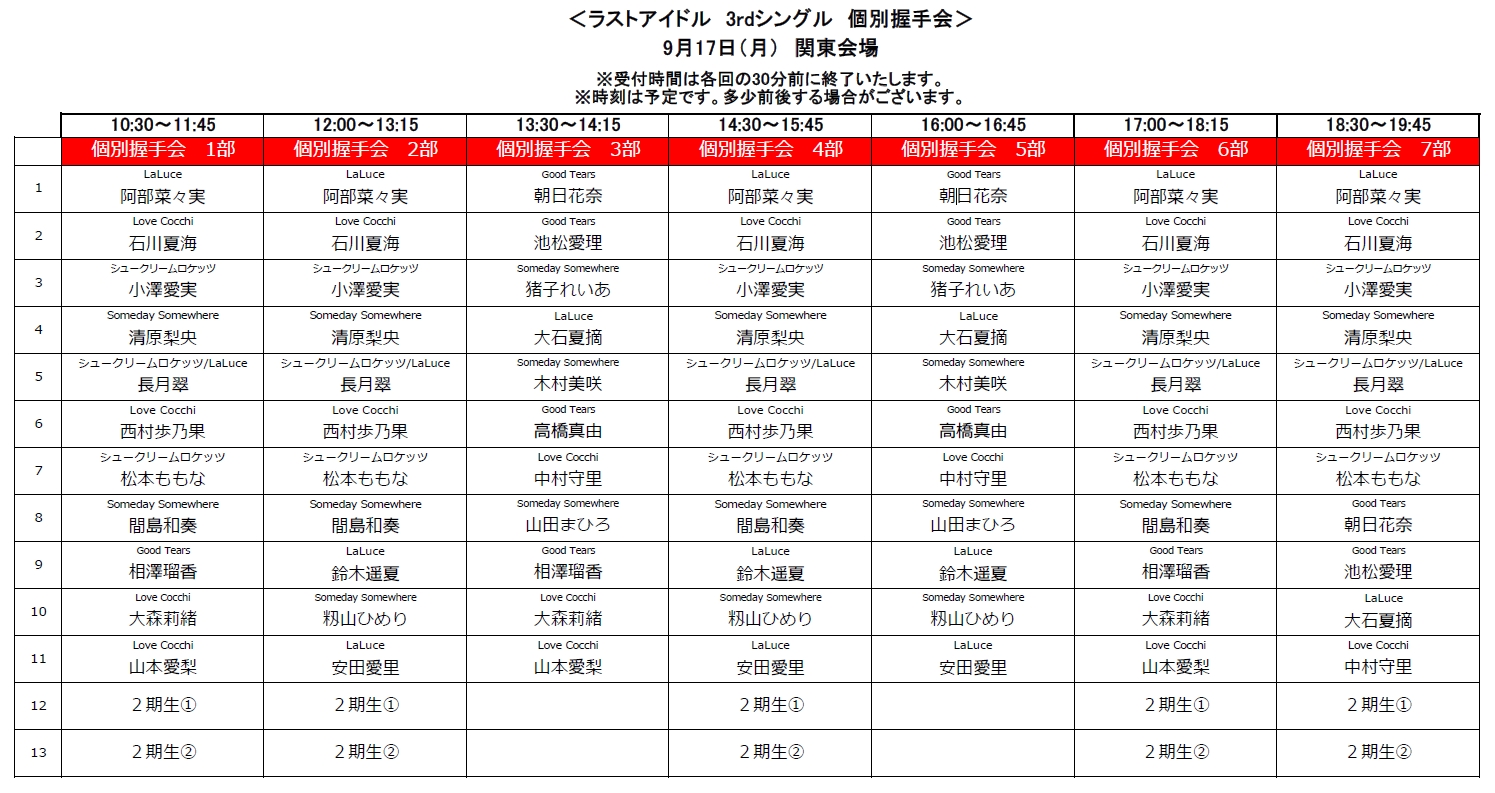 ■いずれの開催日でも、主催者側によって各メンバー別に割り当てた開催時間内での握手対応とさせて頂きます。時間外での対応は致しかねますことをご留意ください。