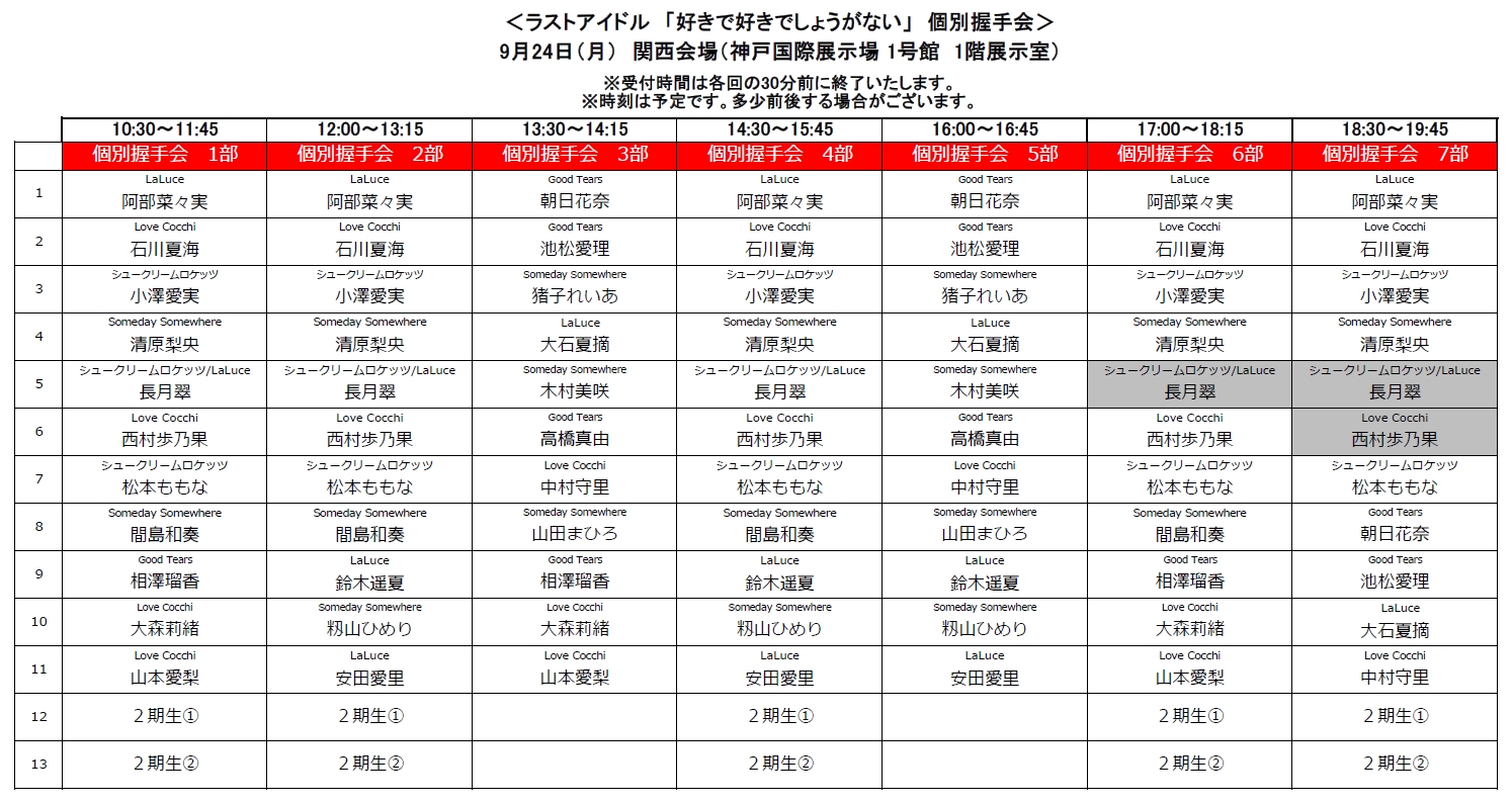 ■いずれの開催日でも、主催者側によって各メンバー別に割り当てた開催時間内での握手対応とさせて頂きます。時間外での対応は致しかねますことをご留意ください。