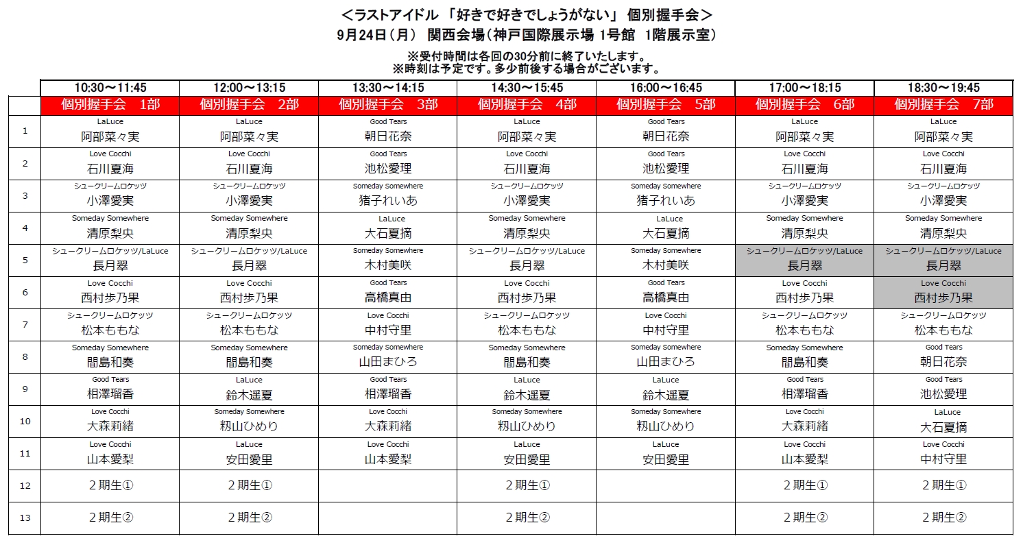 ■いずれの開催日でも、主催者側によって各メンバー別に割り当てた開催時間内での握手対応とさせて頂きます。時間外での対応は致しかねますことをご留意ください。