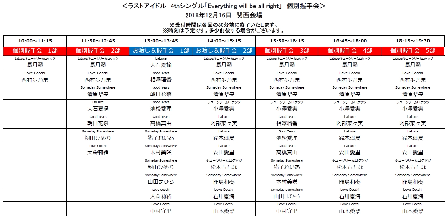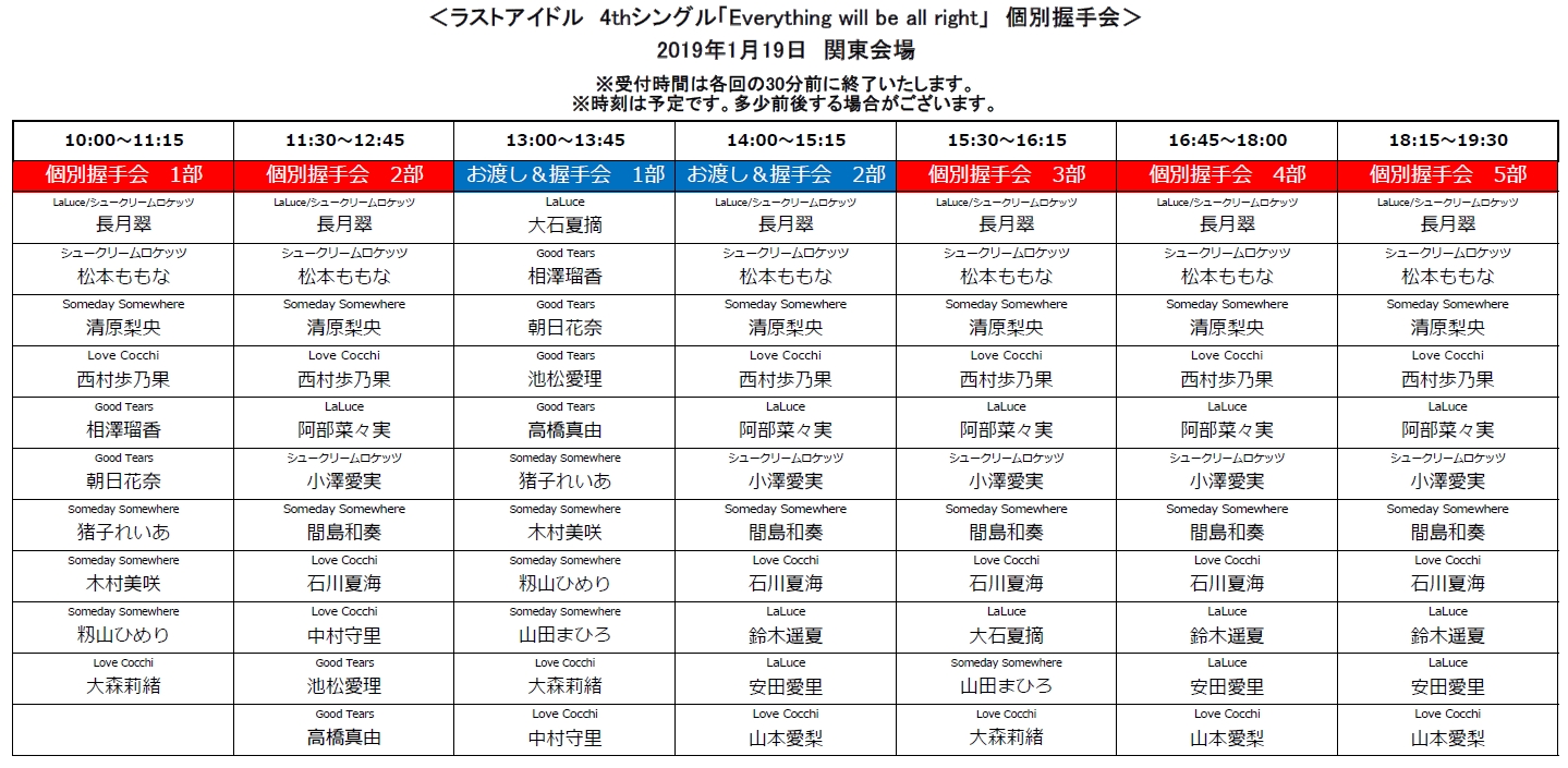 ■いずれの開催日でも、主催者側によって各メンバー別に割り当てた開催時間内での握手対応とさせて頂きます。時間外での対応は致しかねますことをご留意ください。