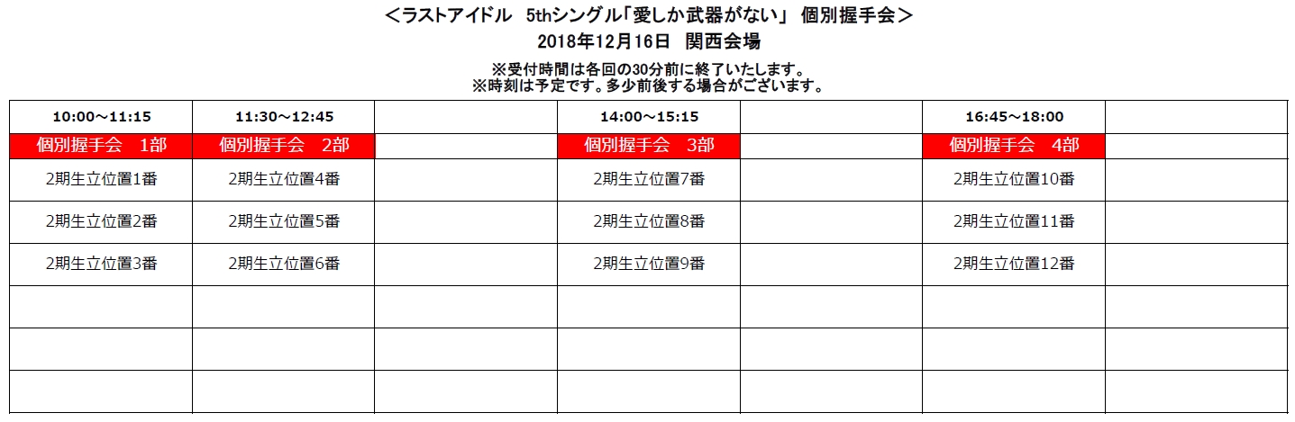 ■いずれの開催日でも、主催者側によって各メンバー別に割り当てた開催時間内での握手対応とさせて頂きます。時間外での対応は致しかねますことをご留意ください。