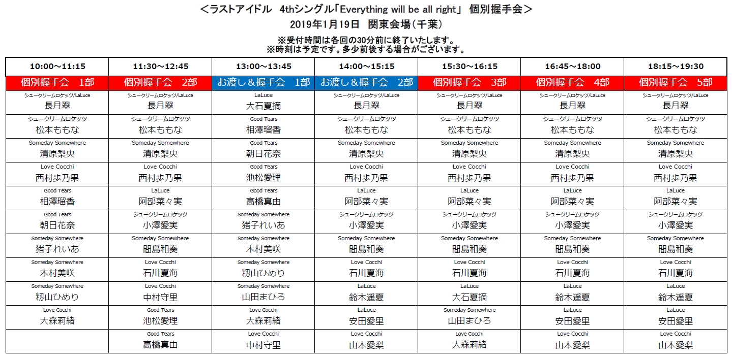 ■いずれの開催日でも、主催者側によって各メンバー別に割り当てた開催時間内での握手対応とさせて頂きます。時間外での対応は致しかねますことをご留意ください。