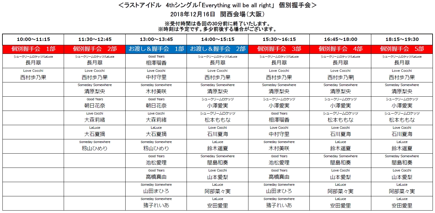 ■いずれの開催日でも、主催者側によって各メンバー別に割り当てた開催時間内での握手対応とさせて頂きます。時間外での対応は致しかねますことをご留意ください。