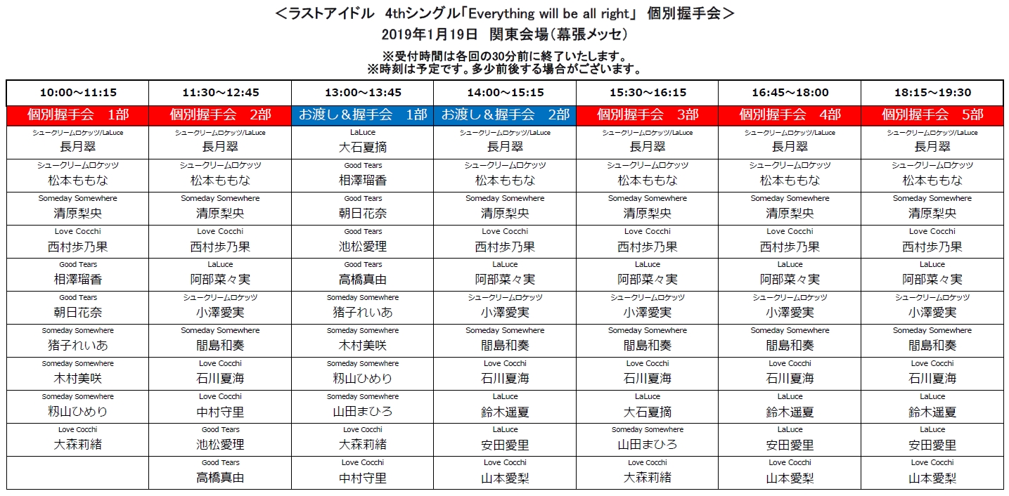 ■いずれの開催日でも、主催者側によって各メンバー別に割り当てた開催時間内での握手対応とさせて頂きます。時間外での対応は致しかねますことをご留意ください。