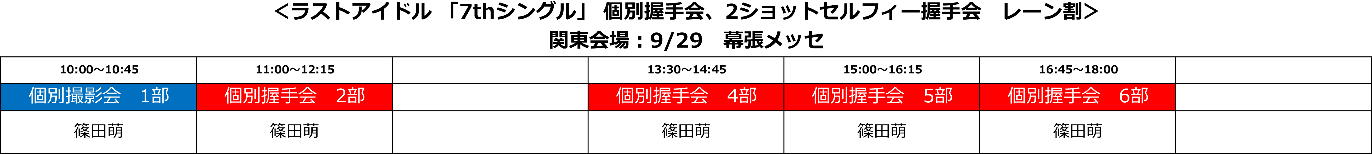 ・振替対象イベントへの参加は、“篠田萌”の対象の部の個別握手会、個別撮影会の参加券をお持ちの方のみとなります。それ以外の部のチケットは振り替えいただけません。