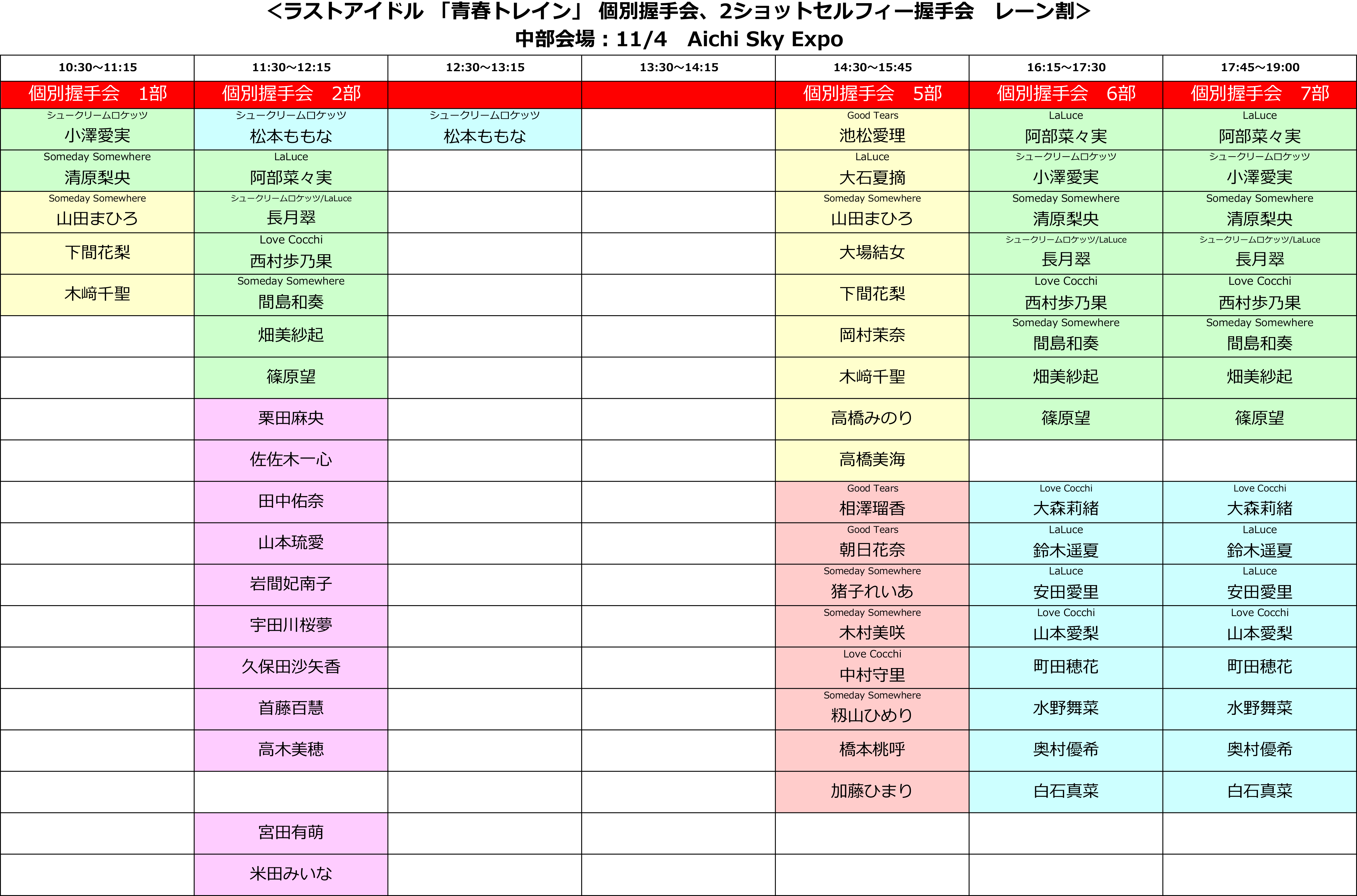 ※1期生の松本ももなにつきまして、11/4中部会場のスケジュールを変更させていただきました。すでに購入いただいたお客様にはご迷惑をおかけして申し訳ありません。詳細につきましてはこちらをご覧ください。