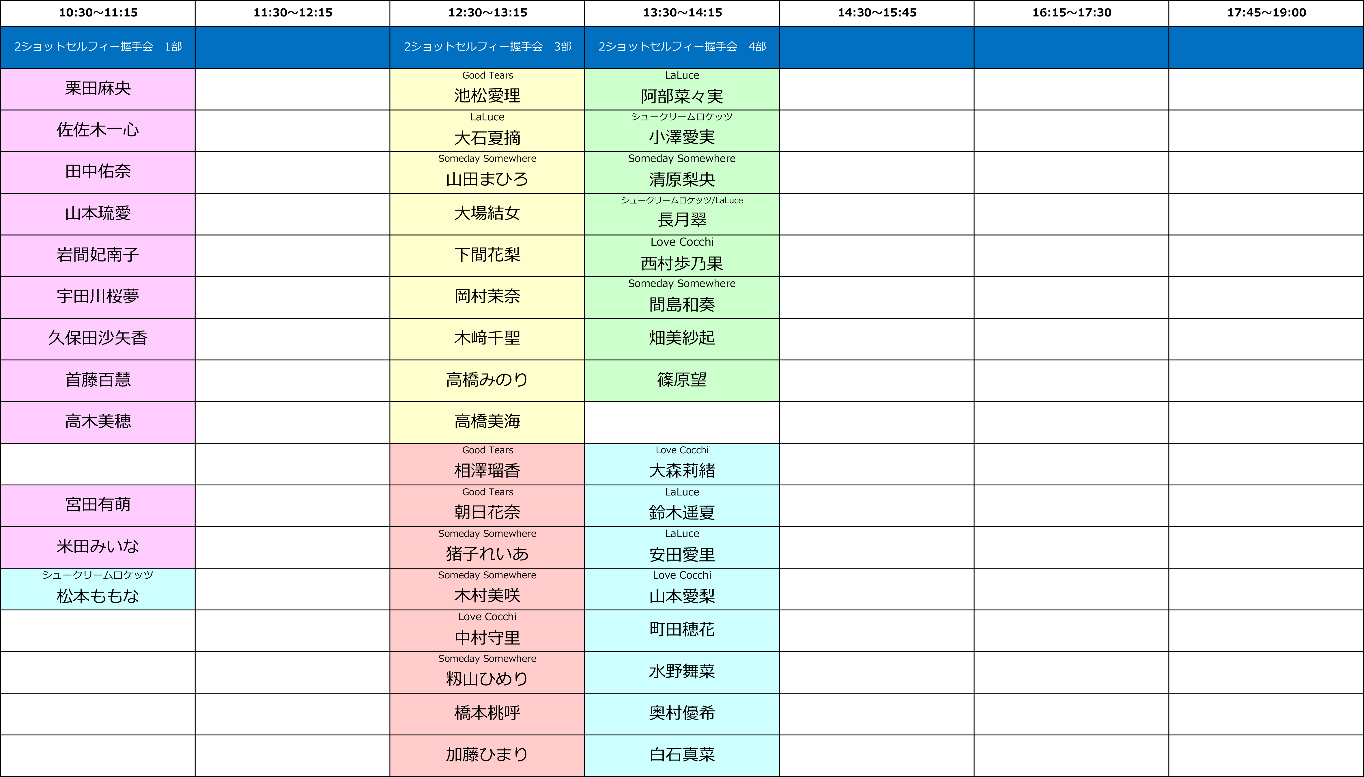 ・いずれの開催日でも、主催者によって各メンバー別に割り当てた開催時間内での握手、撮影対応とさせて頂きます。時間外での対応は致しません。
