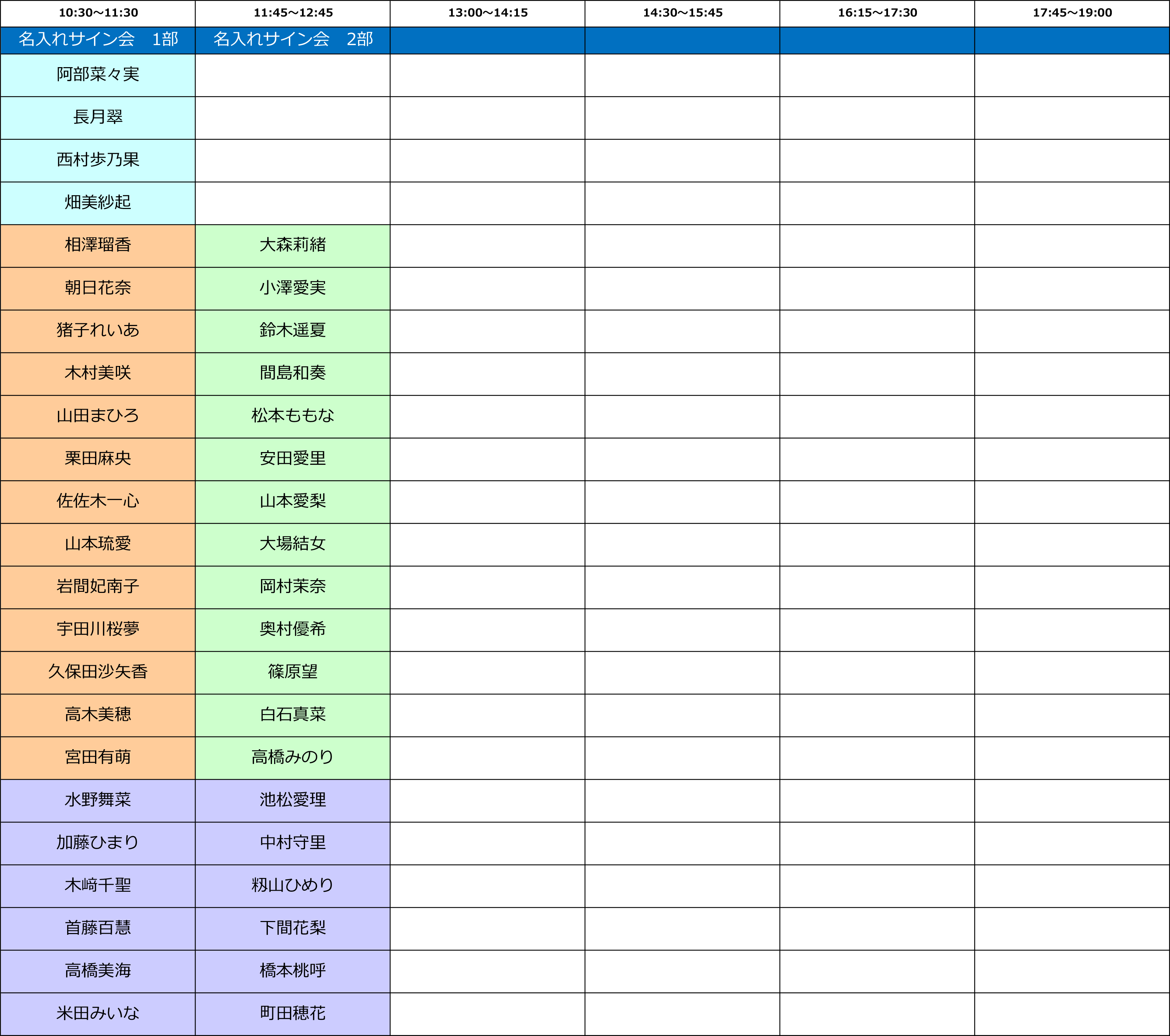 ・握手会、撮影会、名入れサイン会は、握手会ゾーン受付終了後、列が途切れ次第、終了とさせていただきます。終了後はお並びいただいても参加はできません。