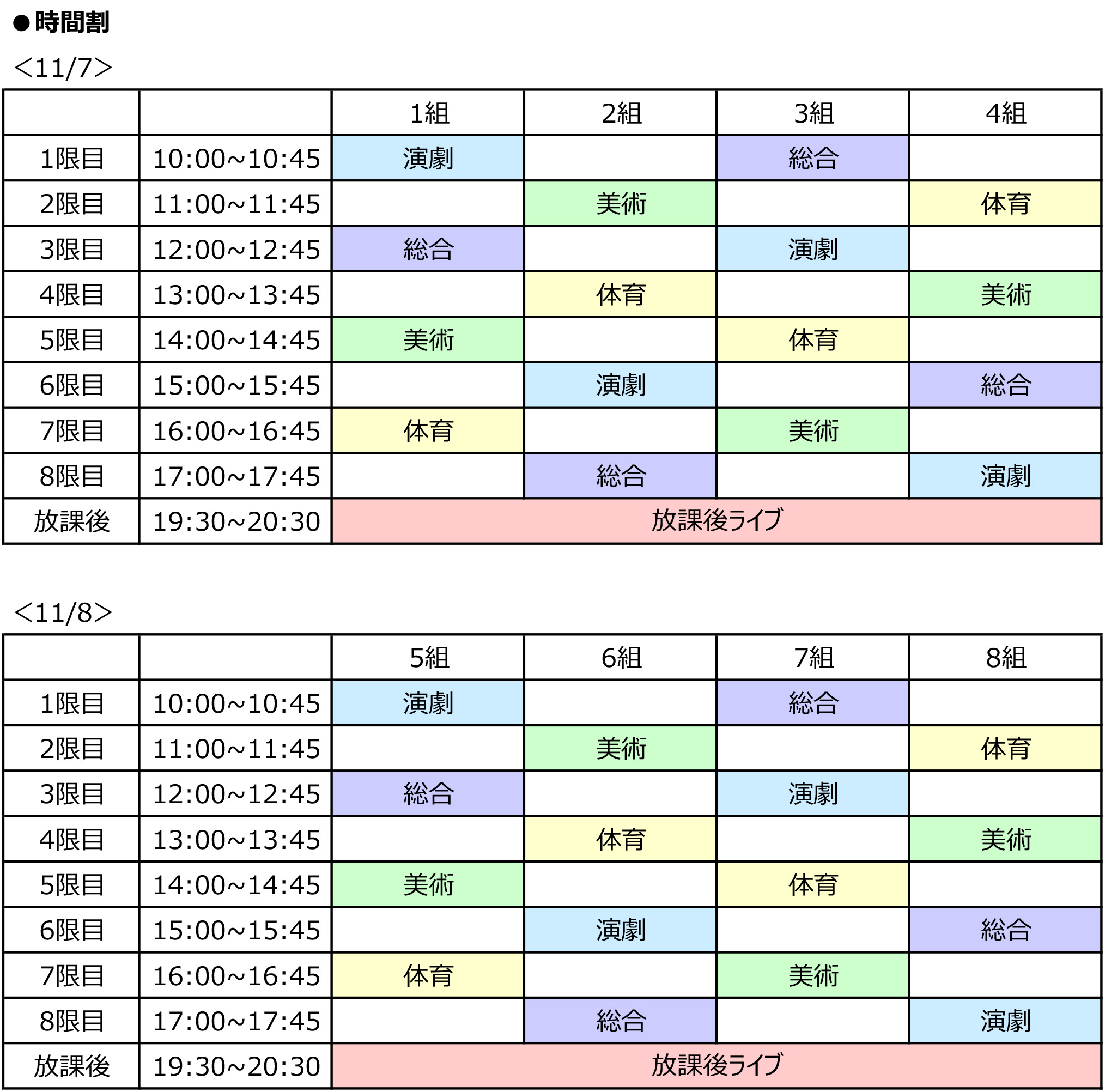 ・クラス別授業のクラスはそれぞれ参加メンバーが異なります。CDご購入の際に日程とクラスをお選び下さい。各クラスとも1日に開催される授業が4教科(「演劇」「総合」「体育」「美術」)あります。
