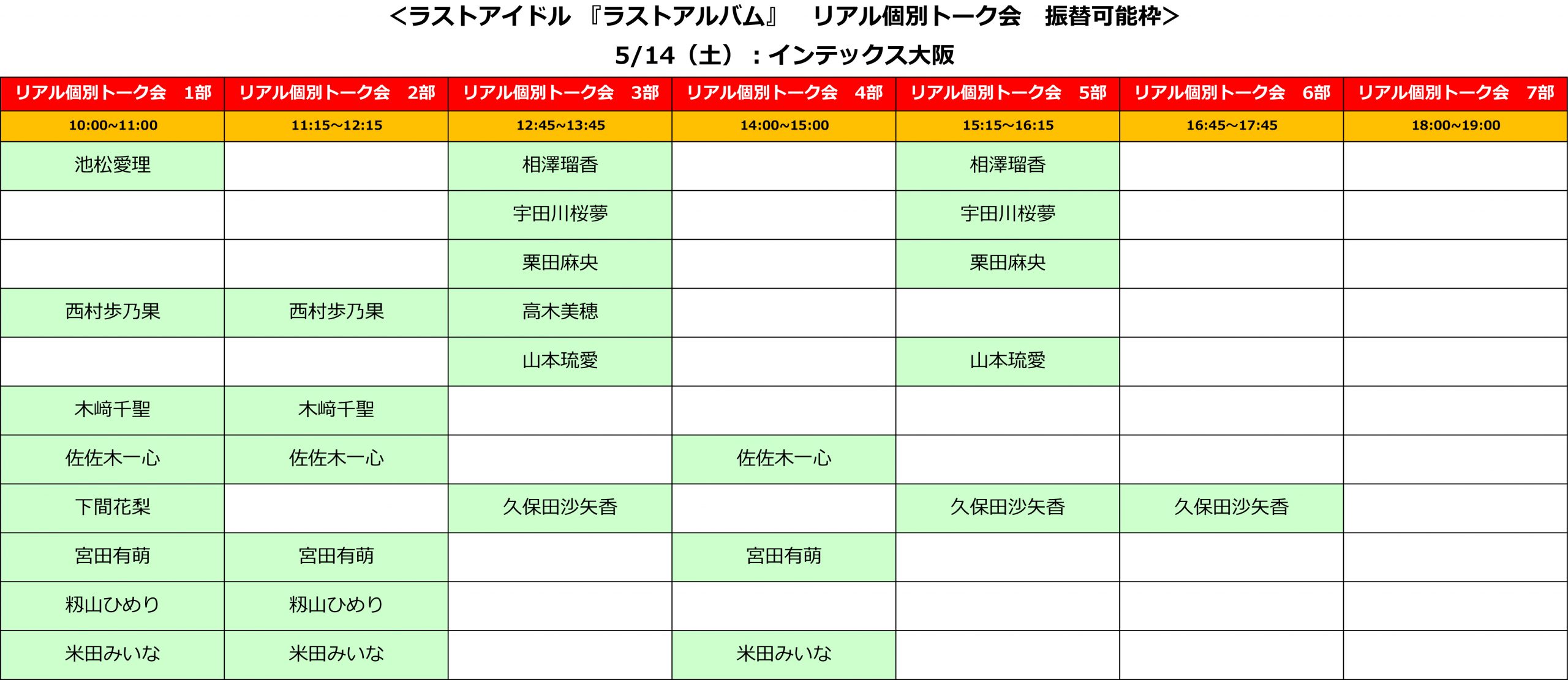 1stアルバム『ラストアルバム』WEB盤イベント“リアル個別トーク会” 5/14(土)@インテックス大阪にて、振替対象参加券がイベント当日のリアル個別トーク会参加券に交換できる枠(部)は下記になります。