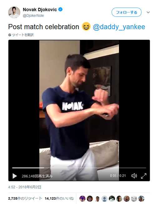 フレンチオープン戦で、ロベルト・バウティスタ・アグート選手との約4時間に渡る大接戦の末、勝利したジョコビッチ選手が、ダディー・ヤンキーの「デュラ」に合わせて祝福ダンス!