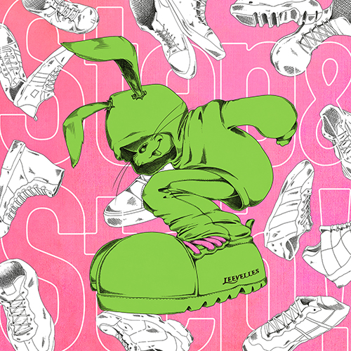 ジャケットは、ウサギが跳び上がる直前の踏ん張りのシーンを絵にしました。