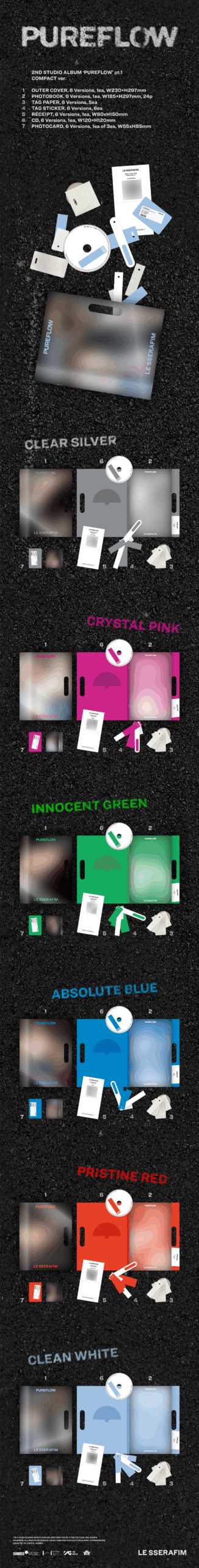 全6形態:2nd Studio Album ‘PUREFLOW’ pt.1 (COMPACT ver.) CLEAN WHITE、CLEAR SILVER、CRYSTAL PINK、INNOCENT GREEN、ABSOLUTE BLUE、PRISTINE RED
