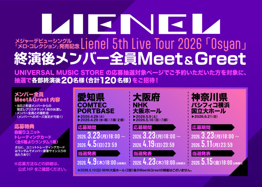 Lienel メジャーデビューシングル「メロ・コレクション」の発売を記念して、下記期間中に応募対象商品をご予約された方の中から抽選でLienel 5th Live Tour 2026「Osyan」終演後メンバー全員Meet&Greetへご招待いたします!