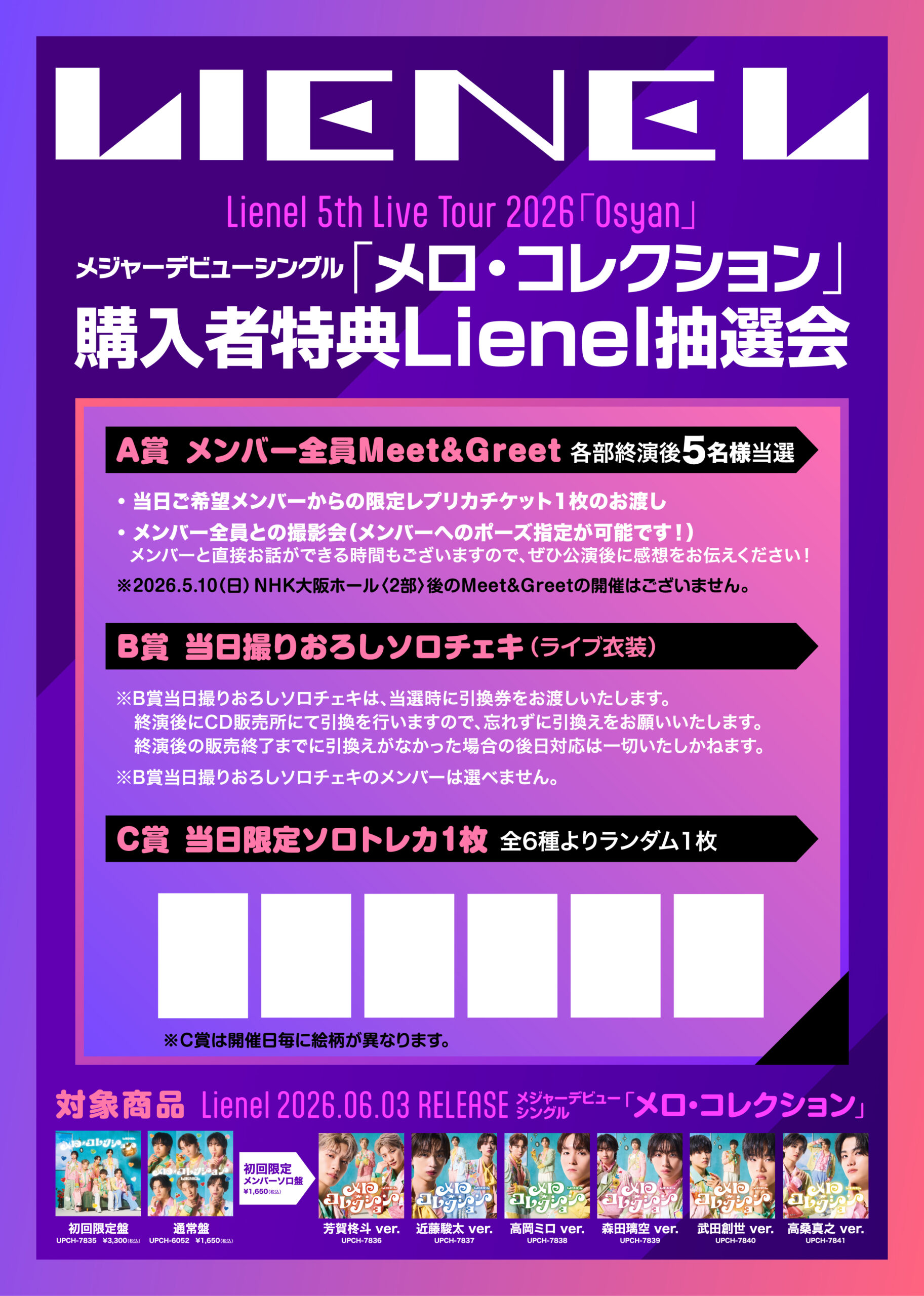 Lienel 5th Live Tour 2026「Osyan」会場CD販売&メジャーデビューシングル『メロ・コレクション』購入者特典「Lienel抽選会」開催決定!