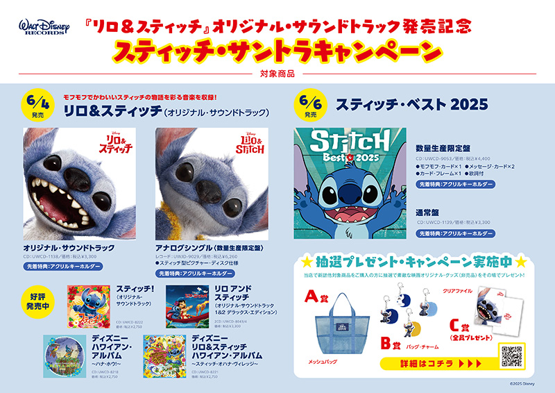 『リロ&スティッチ』オリジナル・サウンドトラック発売を記念して、<スティッチ・サントラキャンペーン>を開催!対象商品をご購入いただいた方の中から先着でジャケット・デザインのクリアファイル(A4サイズ)をプレゼントいたします。また、一部店頭にて抽選でプレゼントが当たるキャンペーンも実施。