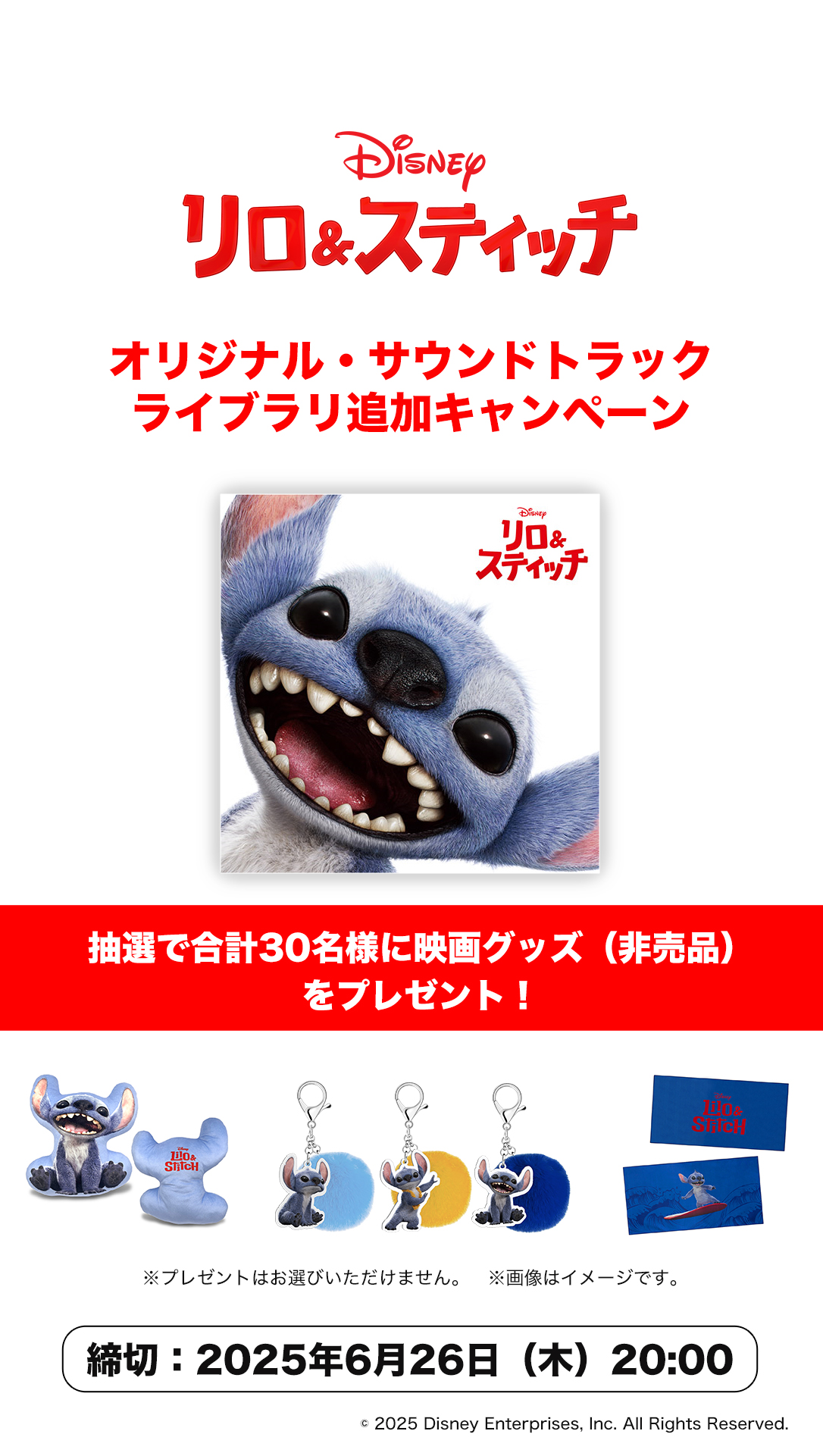 対象の音楽配信サービスで『リロ&スティッチ』オリジナル・サウンドトラックをライブラリに追加し、お気に入りの収録曲を30秒以上再生していただいた方の中から抽選で30名様に映画グッズ(非売品)をプレゼント!