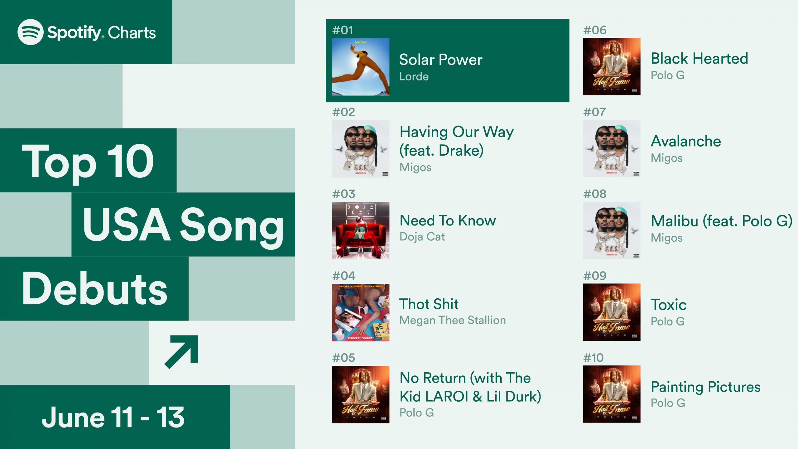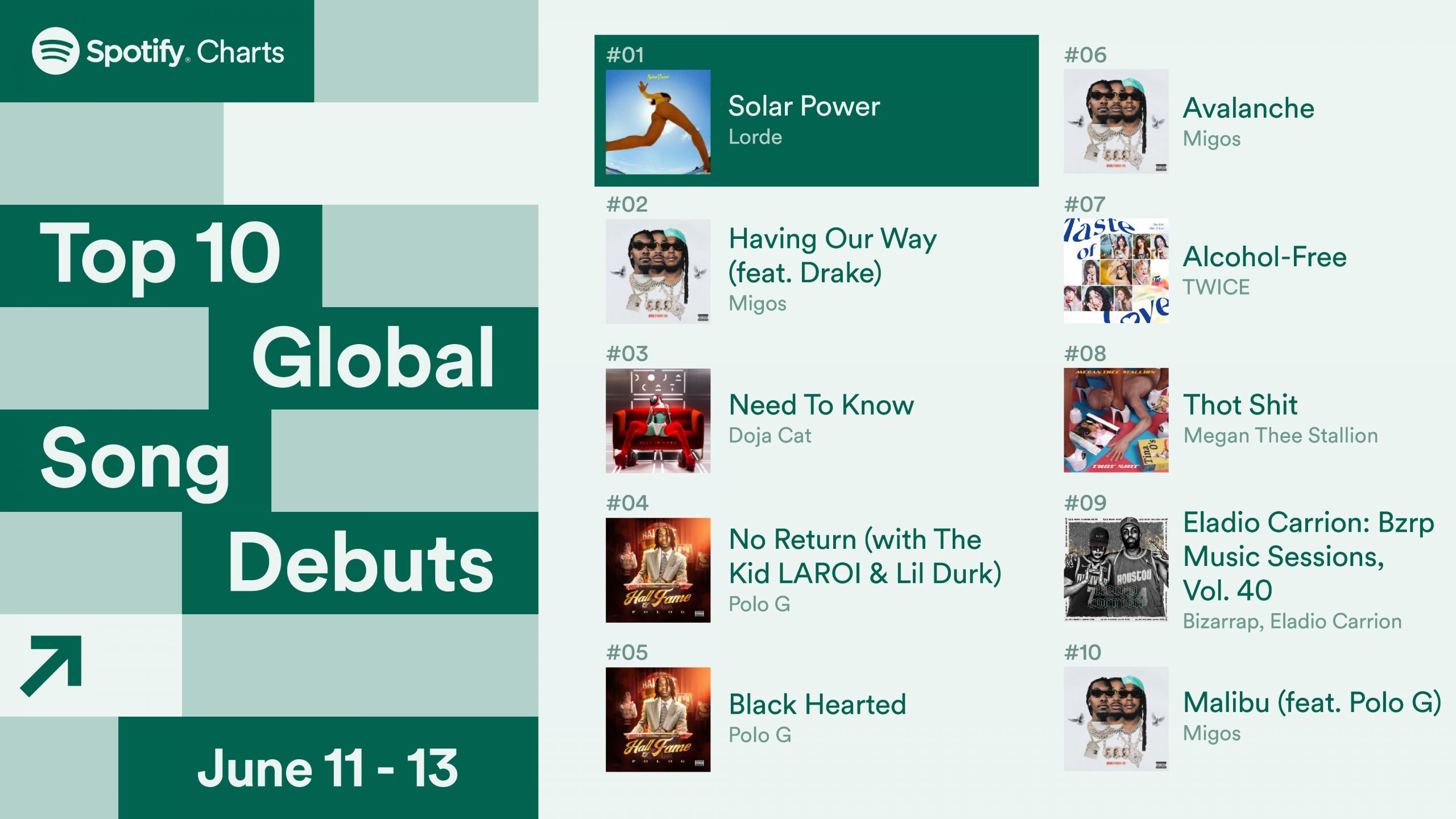先行シングルであり、タイトルトラックでもある「Solar Power」は、Spotify GlobalおよびUSにおけるデビュー週に最もストリーミングされた回数を計るチャートにおいて初登場1位、さらに同時公開されたミュージック・ビデオがYouTube USのトレンドビデオとして1位を獲得。Twitterでは「Lorde」というワードが世界トレンドを含めアメリカやイギリスなどのTwitterトレンドで1位となり、大きな話題を呼びました。