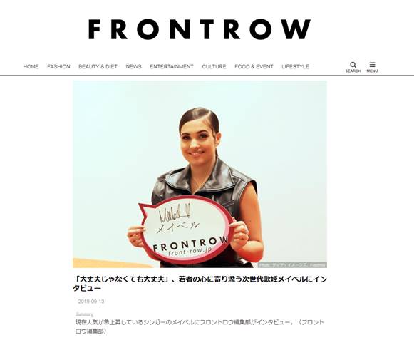 WEBメディア「FRONTROW」で来日時のインタビュー記事が公開! 2019.09.14 MEDIA - WEB 【「大丈夫じゃなくても大丈夫」、若者の心に寄り添う次世代歌姫メイベルにインタビュー】 https://front-row.jp/_ct/17302049