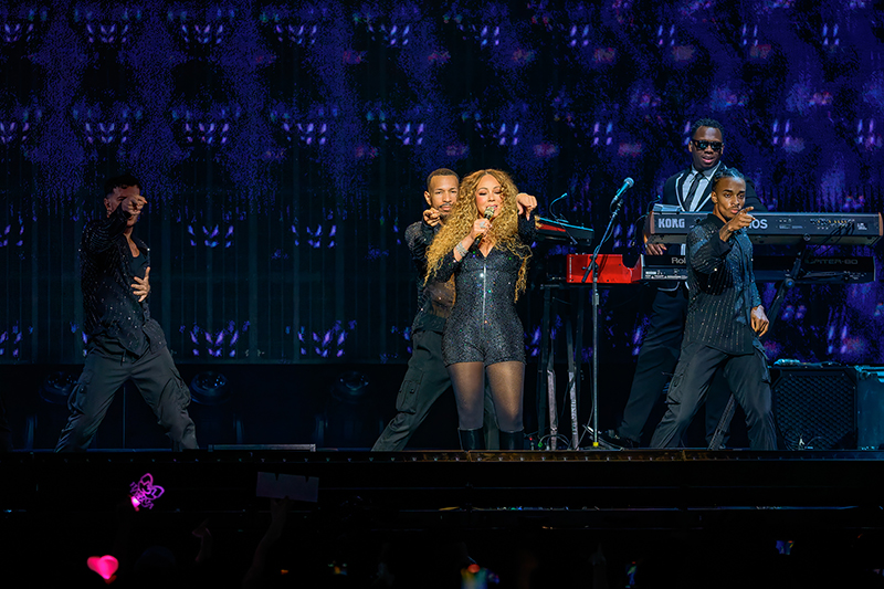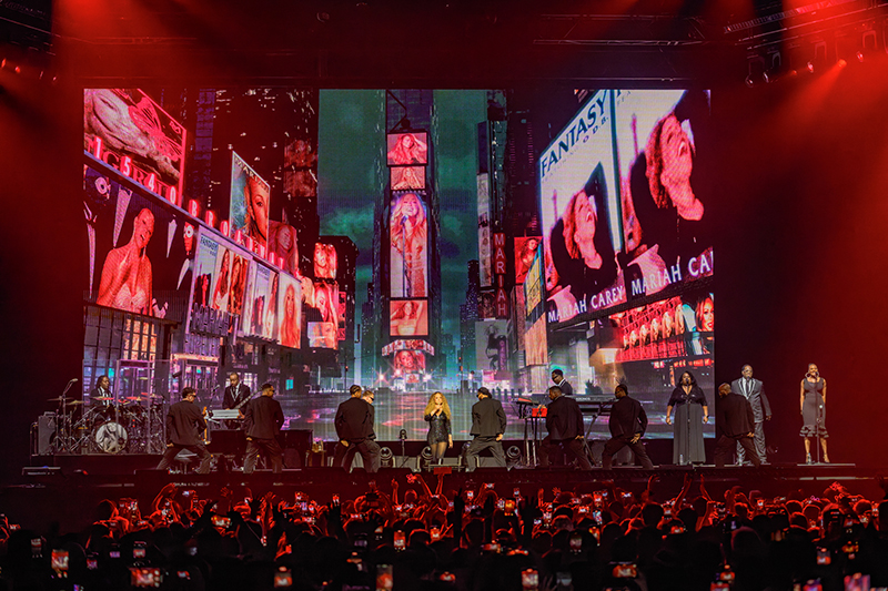 今回のツアーの土台は、2024年4月からスタートしたラスヴェガスのレジデンシー公演である。「アクト1」から「アクト4」までの4幕構成、つまりゆるく起承転結をつけている。ヒップホップを取り入れたよりモダンな“MIMI”としての20年間をセレブレートしながら、90年代を制した歌姫の側面もしっかり想い起こし、そして新章としての『Here It For All』も聴かせる、とても凝った構成なのだ。