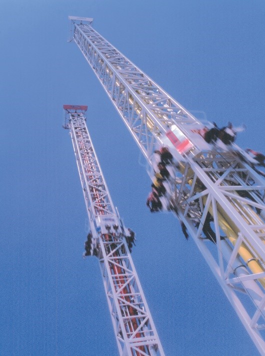風を切って4Gの重力で打ち上がるクレージーヒューと日本初マイナス2Gの重力で一気に落下するクレージーストン。『祭nine.が発射音の掛け声』とともに爽快感と浮遊感を体験してください。