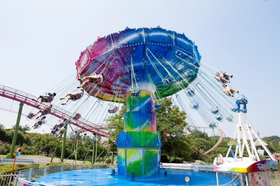 くるくる回る空中ブランコ。『祭nine.のBGM』で大空を飛んでいるような気分をお楽しみいただけます。