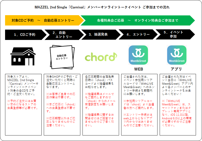 ※メンバーオンライントークイベントは、対象ストアで対象商品をご予約・ご購入いただくと同時に自動応募エントリー(お客様でのご応募作業は不要です)になり、抽選結果は抽選システム「chord」にて発表、ご当選された方は「WithLIVE Meet&Greet」アプリよりご参加いただきます。