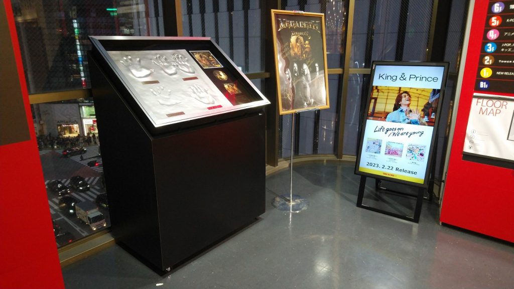 メガデスの来日時の2月26日(日)にタワーレコード渋谷店B1F CUTUP STUDIOにて行ったインストア・イベント終了後に楽屋で収録したメンバー全員の手形の展示が、タワーレコード渋谷店6階でスタートしました。