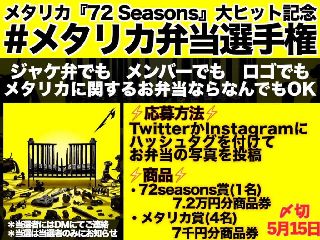 こちらは、TwitterかInstagramに、「#メタリカ弁当選手権」というハッシュタグとともに、メタリカに関するお弁当の写真をアップすれば応募が完了となる。お弁当の写真はメタリカのジャケット写真を描いたジャケ弁はもちろん、メンバーの顔や、メンバーの楽器、ロゴやアルバムタイトルや楽曲名など、メタリカに関するものを表現すればなんでもOKとなる。〆切は5月15日中。商品として『72 Seasons賞』として1名に7.2万円分の商品券、『メタリカ賞』として4名に7000円の商品券が送られる。