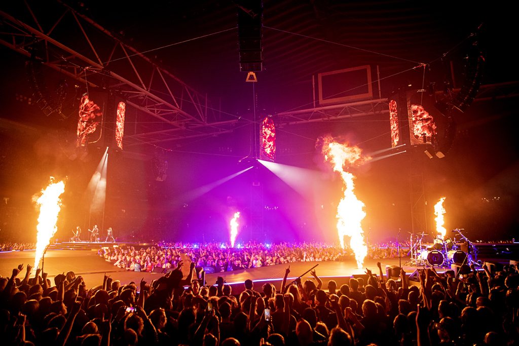 この日の上映開始は19時45分。実際の演奏が始まる前には会場内の様子、カメラに向かってアピールする現地ファンの興奮ぶりが映し出された。その“開演待ち”の時間を冗長と感じる向きもあっただろうが、現地に居合わせているような臨場感を高めてくれる趣向ではあったように思う。しかも実際の演奏が始まる前に、会場の規模の大きさや、異様ともいえるステージの形状などを確認することが出来る。筆者は今回のツアーの初演となったオランダはアムステルダムでの公演を現地で目撃しているが、その際も会場に足を踏み入れた瞬間、まずそのスケール感に驚かされたものだ。言い換えれば「雰囲気にのまれる」ということでもあるわけだが、それもまたライヴを楽しむうえで欠かせないイントロダクションだといえる。