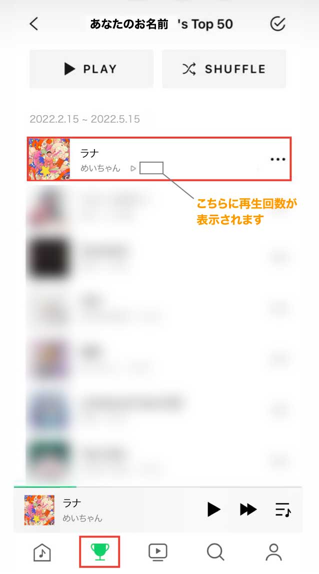 - ※再生回数は、LINE MUSICの「トップページ」⇒下のタブ「ランキング」内⇒「(あなたのお名前)’s Play TOP 50」で確認することができます。