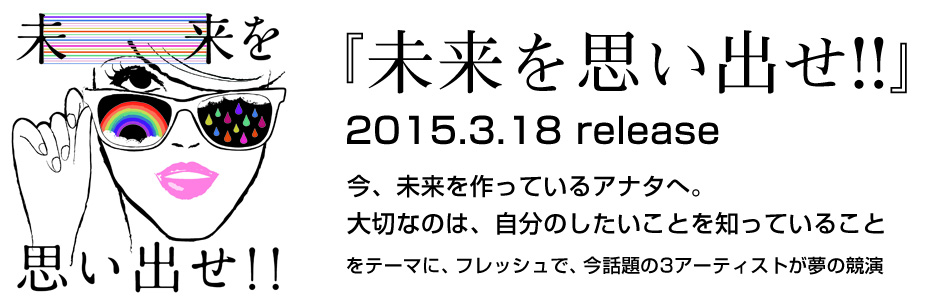 NEW RELEASE 【今、未来を作っているアナタへ。大切なのは、自分のしたいことを知っていること】をテーマに,フレッシュで、今話題の3アーティストが夢の競演 New Comer 3アーティストによるコンピレーションMAXI CD CD MAXI 未来を思い出せ!! 発売日 2015.03.18 価 格 ¥1,320 (税込) 品 番 UPCY-5003 BUY NOW BUY NOW MORE