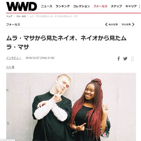 WWD JAPANにて、来日時のインタビューが公開! 2018.12.28 MEDIA - WEB 2018年12月5日(水)に「EX THEATER ROPPONGI」でライブを行ったムラ・マサ。オープニング・アクトとして急きょ参加し、ムラ・マサと同郷で公私ともに仲が良いR&Bシンガーのネイオも交えての貴重なインタビューです。 https://www.wwdjapan.com/764346