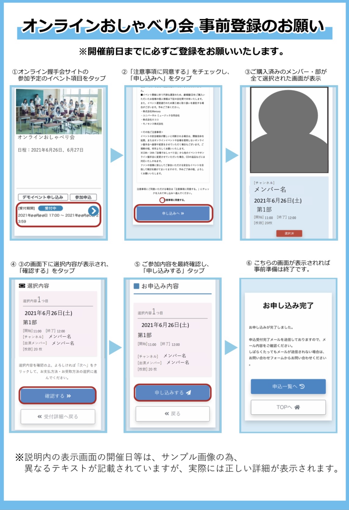 お手数をおかけしますが「オンライン握手会申込サイト」にて「必要事項」および「顔画像」のご登録をお願いいたします。
